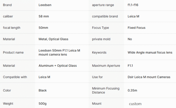Designed specifically for Leica M mount cameras, this lens is perfectly compatible with Leica M-series rangefinder cameras (and, via adapter, mirrorless cameras from Sony, Fujifilm, etc.). As your trusted lens supplier, we prioritize precision in our design, ensuring a secure and smooth connection between the lens mount and the camera body. While the specifications mention a “Custom” mount, offering cost-effective third-party alternatives within the M-mount ecosystem represents a significant niche market, helping retailers attract advanced photographers with limited budgets who crave a Leica experience.