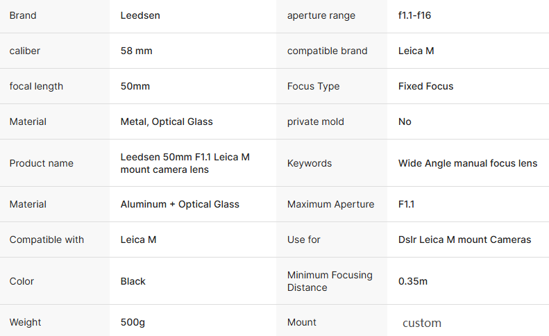 The 50mm lens, often called the “standard lens,” is an essential focal length in every photographer’s bag. As a source camera lens factory, Leedsen offers this high-performance lens that combines a large aperture and the enjoyment of manual focus. Although the specifications state “No Private Mold,” this means we can provide more flexible procurement and cooperation options for B2B clients. Whether you’re a supplier for wholesale stock or a partner seeking brand customization, this 50mm F1.1 lens offers a highly cost-effective market entry point, helping you achieve higher profit margins in the fiercely competitive photography equipment market.