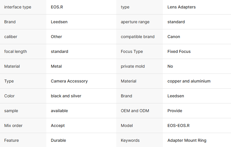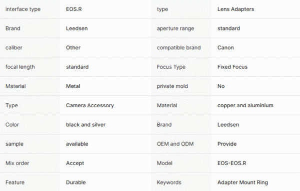 Although this product is a standard mold design, we offer comprehensive OEM camera accessories supplier services. Due to mature molds and stable production lines, we can provide highly competitive prices and extremely short delivery cycles. We support laser engraving of customer logos and customized brand packaging (Color Box Design), helping you quickly enter the market with minimal trial and error costs. For e-commerce sellers and distributors, this is an efficient EF to EOS R adapter wholesale solution for expanding product lines and increasing average order value.