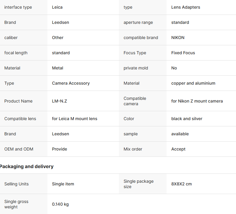 • Technical Highlights: Professional-grade LM-N.Z adapter ring, made of CNC precision-machined copper-aluminum alloy, specifically designed for adapting Leica M lenses to Nikon Z bodies, ensuring infinity focus and ultimate durability.