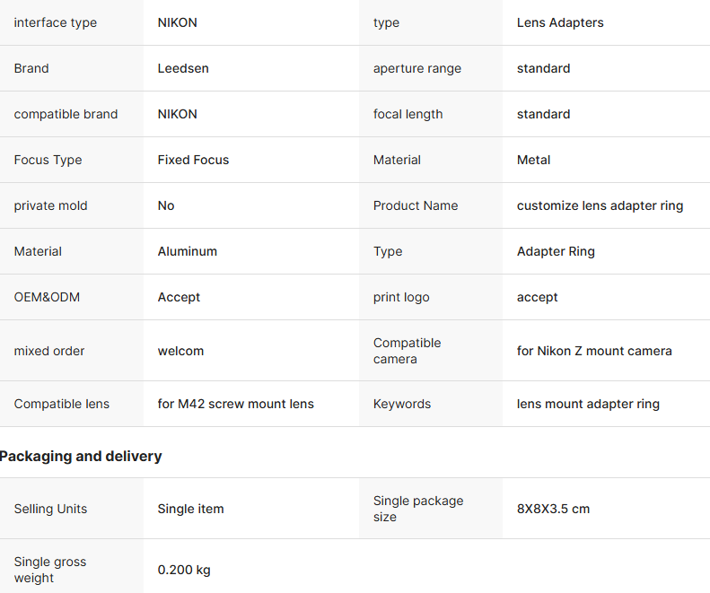 The Leedsen M42-N.Z adapter ring is made of high-quality aluminum alloy, precision CNC machined. Unlike the thin and inexpensive adapter rings on the market, our product weighs a substantial 0.200kg. This robust design effectively absorbs shutter vibration and provides excellent balance when mounting heavy, classic M42 metal lenses. As a quality-focused lens adapter manufacturer, we ensure the threaded interface is wear-resistant and deformation-resistant, maintaining a silky smooth damping feel even under frequent screw-in and screw-out use, making it a reliable and stable accessory for professional photographers.